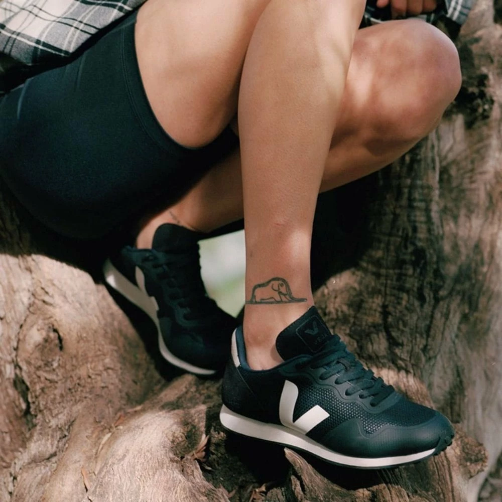 Super cool and iconic, a perfect black trainer from Veja. Alveomesh is a technical fabric made exclusively from recycled plastic bottles It brings breathability, flexibility and lightness to the shoe Panels and V logo are made out of vegan suede Made in Brazil Veja means “look” in Portuguese – look meaning “transparency” One of our favourite brands as its sustainable, ethical & fairtrade credentials